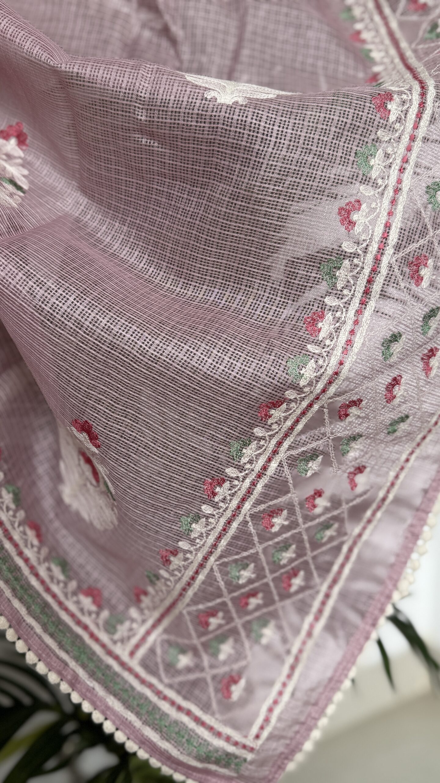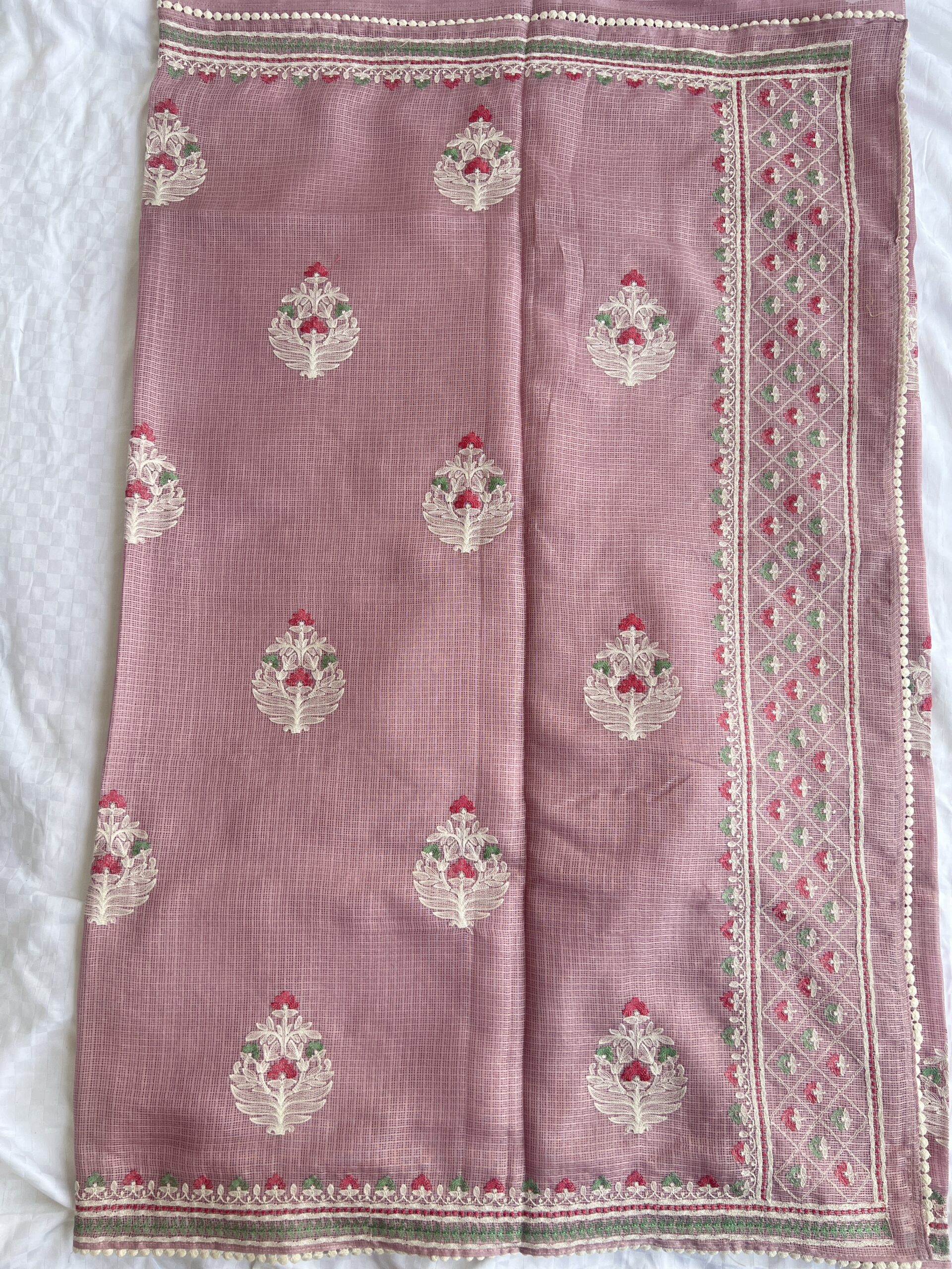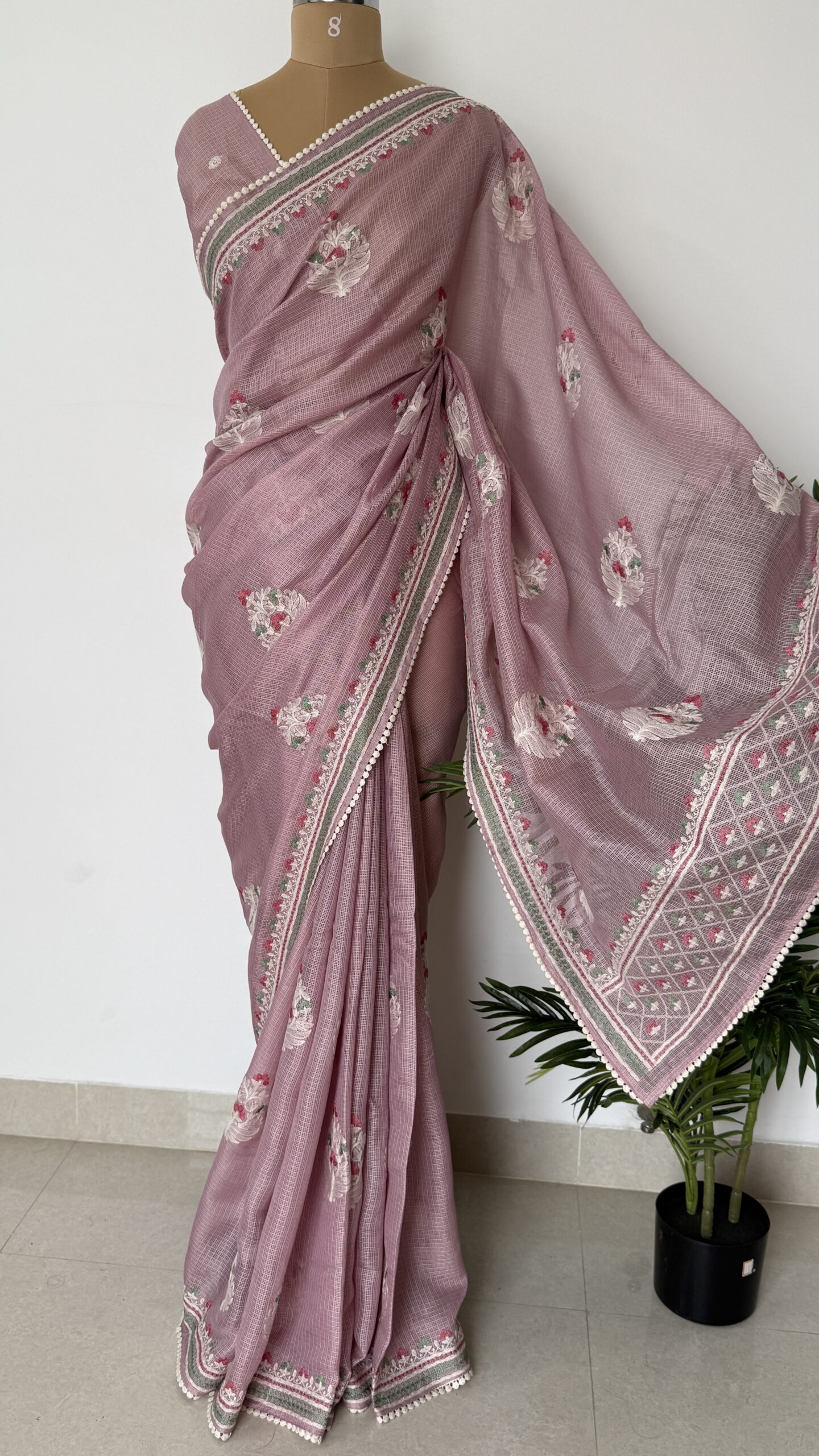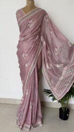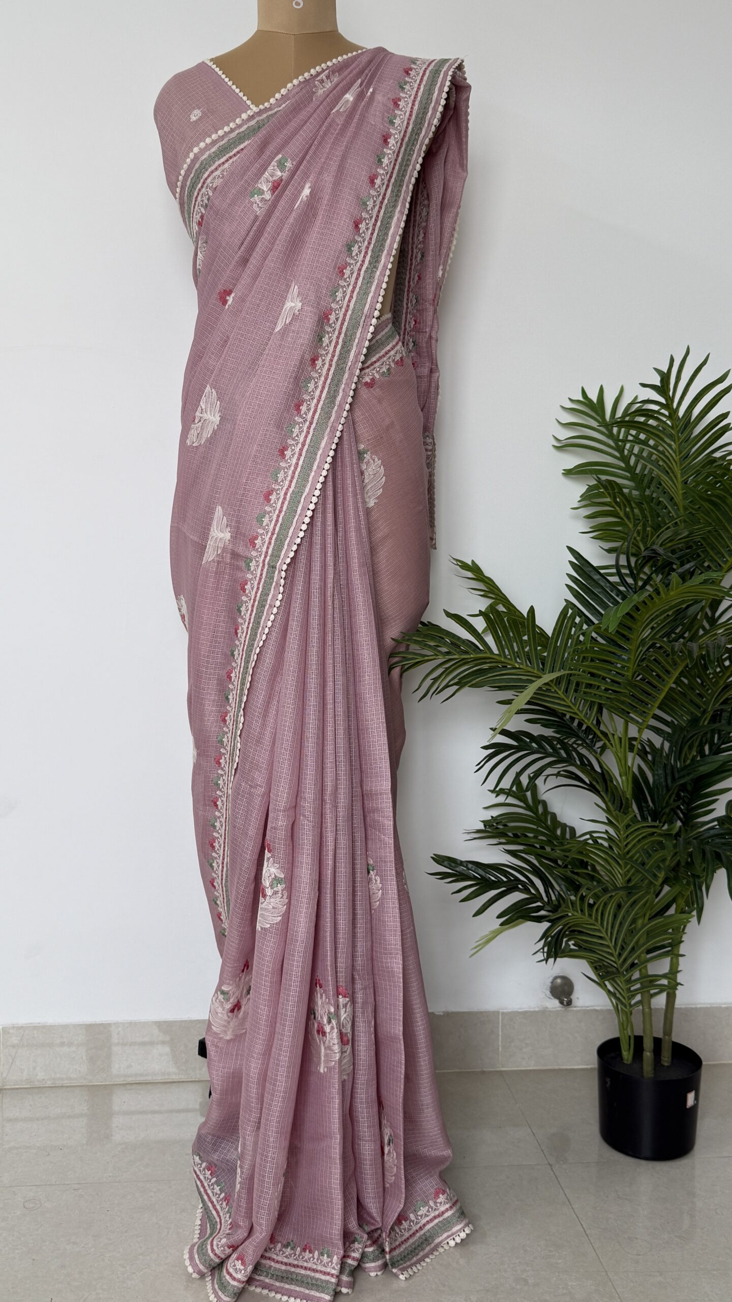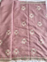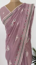 Adorned with beautiful embroidered motifs, each detail reflects the craftsmanship and artistry of traditional embroidery. The subtle floral patterns add a touch of grace, making this saree a timeless piece in your wardrobe.
