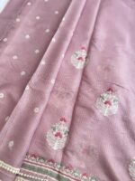 The saree is further accentuated with a lace border, which lends an understated yet elegant look. The intricate lace work seamlessly blends with the soft pink hue, creating a harmonious balance of style and tradition.