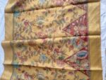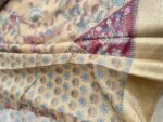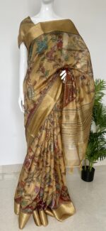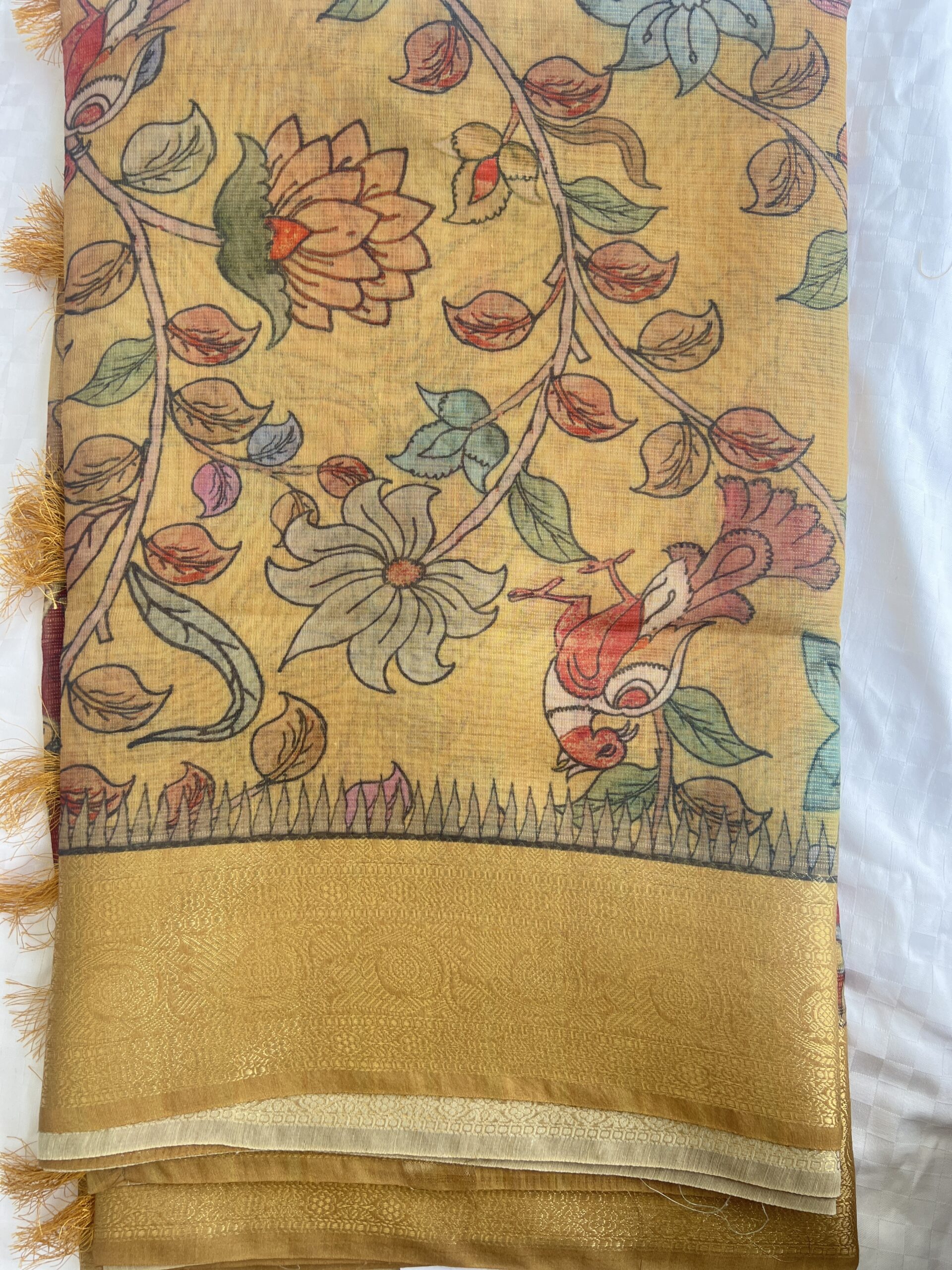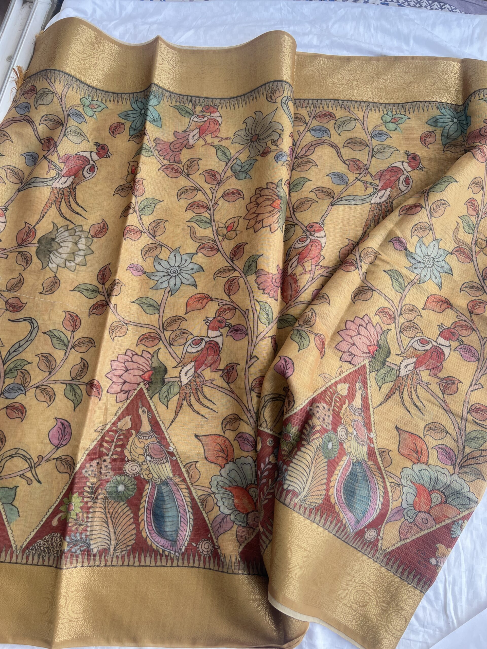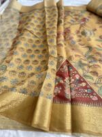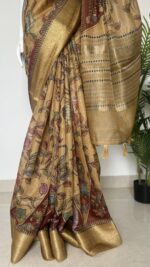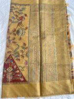 The saree boasts a mustard color, beautifully complemented by a printed Kalamkari pattern that adds a touch of artistry to the ensemble. The border is crafted in Banarasi woven design, adding an element of grandeur and sophistication.
